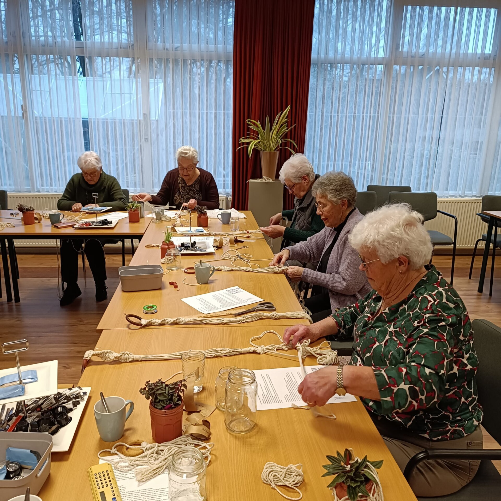 De workshop werd begeleid door een team van enthousiaste vrijwilligers die niet alleen hun technische vaardigheden, maar ook hun gezelligheid inbrachten. Onder hun begeleiding leerden de deelnemers verschillende knooptechnieken, waarmee ze prachtige plantenhangers maakten. Voor sommigen was het de eerste kennismaking met macramé, terwijl anderen hun creatieve vaardigheden verder konden uitbreiden.